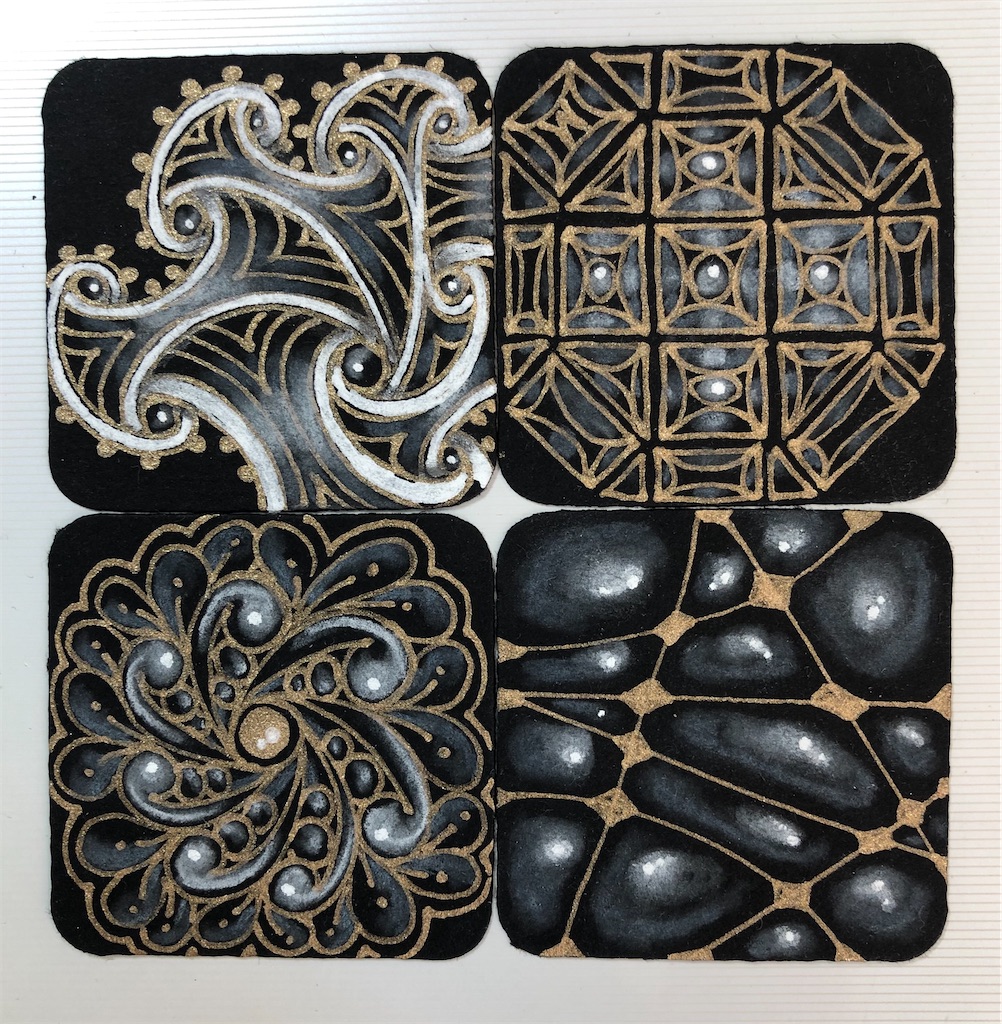 私は1枚目、トリポリと同じ描き方で、四角でスタートするマンオーマンというタングルを描きました。